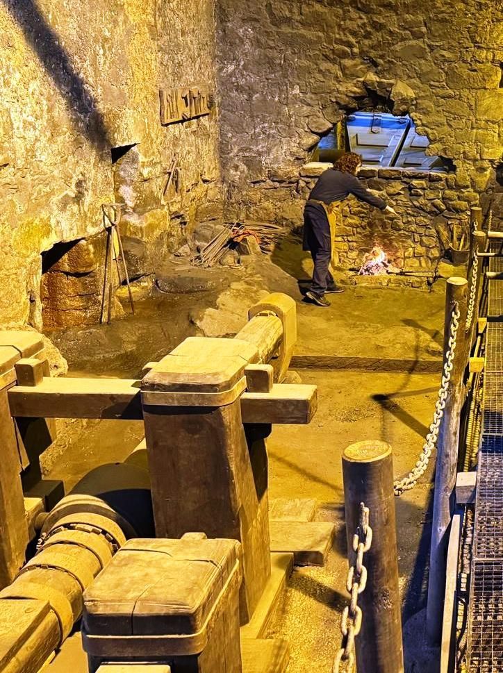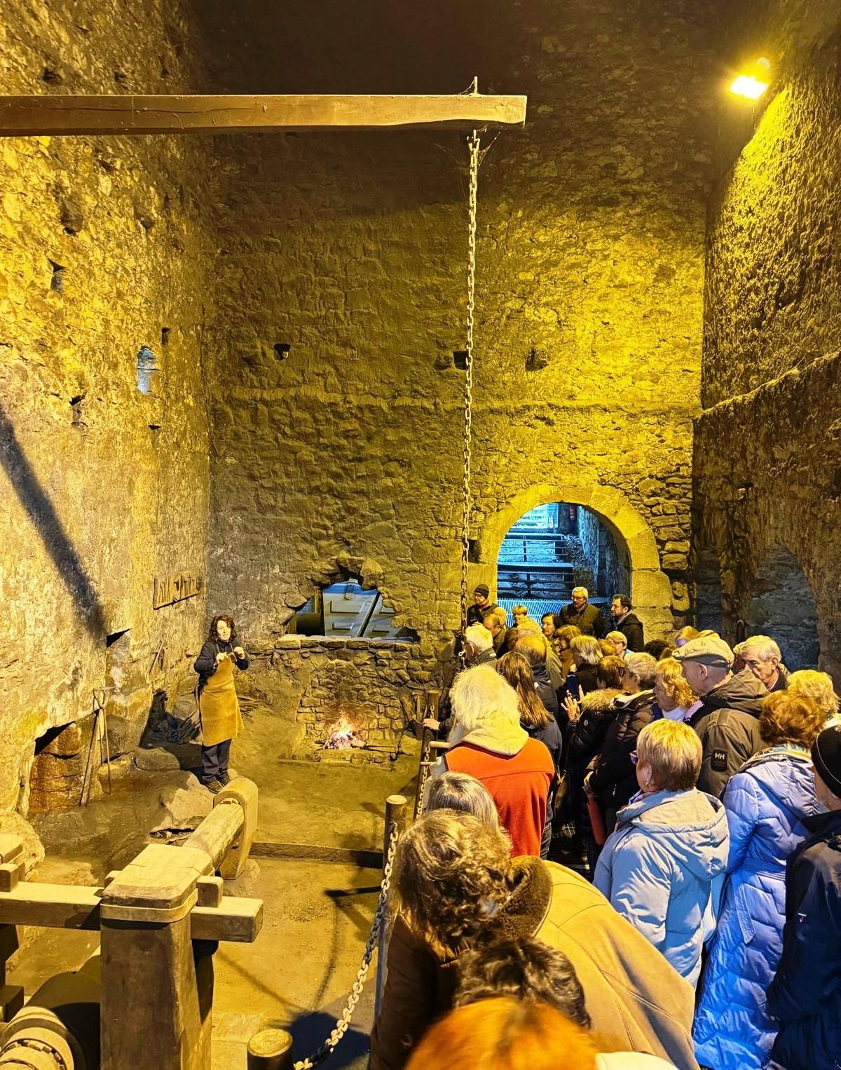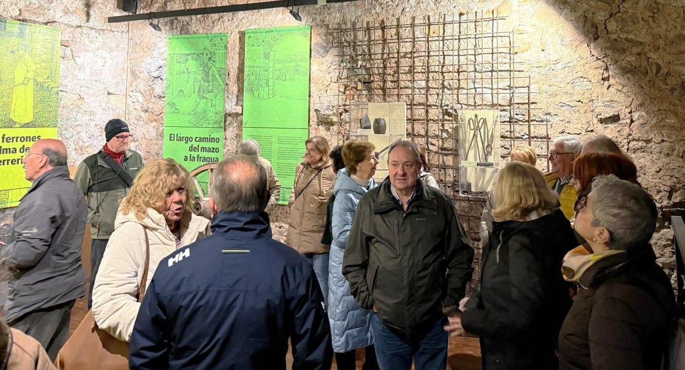 (pequeña localidad del municipio de Herrerías en el Valle del Nansa) para realizar una visita guiada a su restaurada Ferrería. Allí nos esperaba Marián quien con sus excelentes explicaciones nos introdujo en el conocimiento de las “industrias” del siglo XVIII, principalmente en las ferrerías y los molinos harineros. La visita consistió en la descripción de las estancias dedicadas a almacenes y lo que es propiamente el taller donde con la fuerza del agua se consigue que funcionen tanto dos grandes fuelles que consiguen mantener el fuego a más de 1000 grados para que el mineral de hierro se ponga al rojo vivo. Igualmente, el agua que cae hace que se accione un enorme martillo que se utiliza para quitar la escoria del mineral mediante un golpeo constante, mientras los ferrones van moviendo citado mineral hasta conseguir un “tocho” de hierro puro de unos 60 kilos de peso. Este tocho es vendido a los herreros para que en las fraguas fabriquen todo tipo de herramientas, armas, etc.