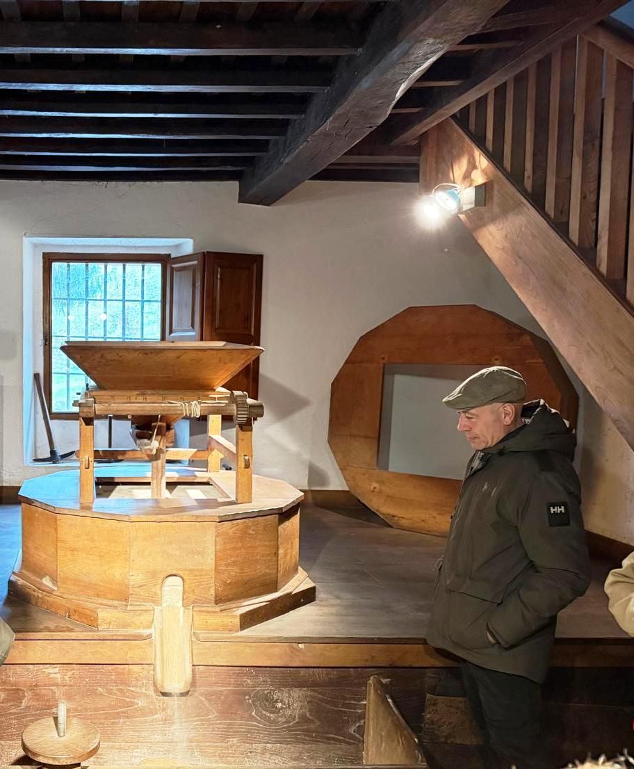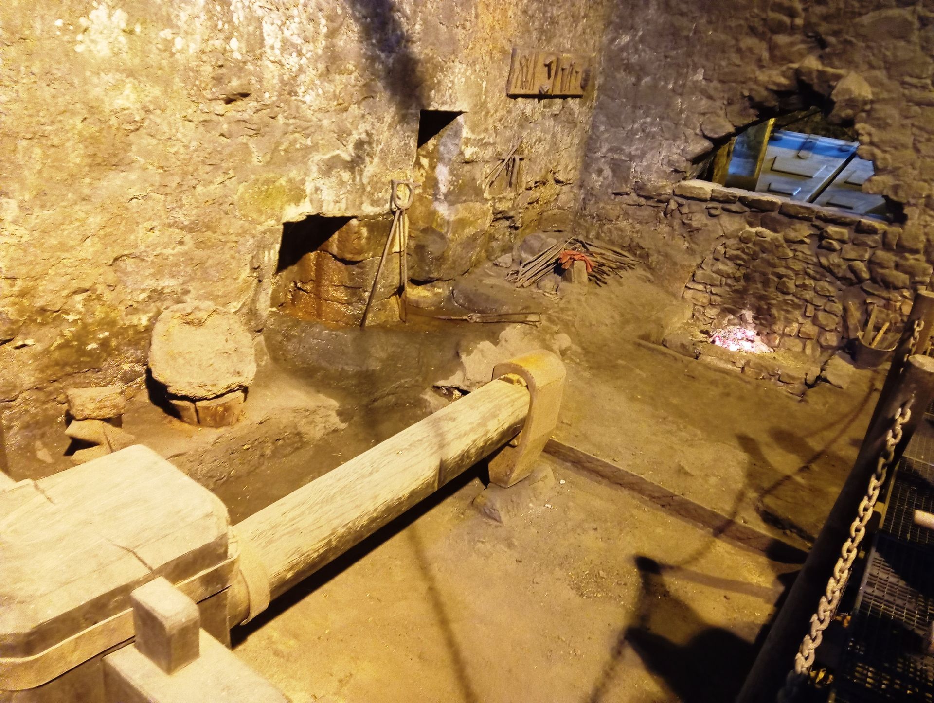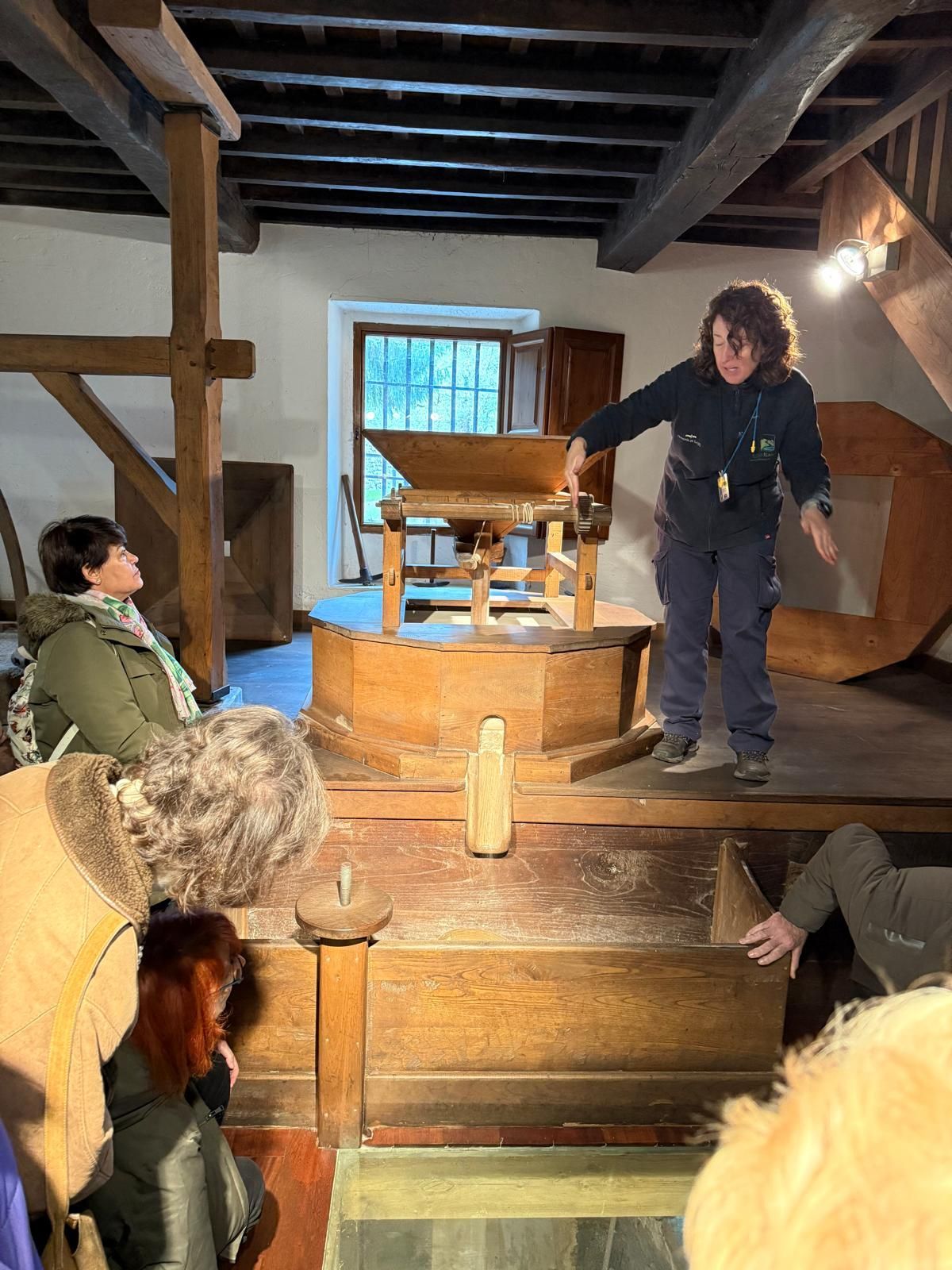 (pequeña localidad del municipio de Herrerías en el Valle del Nansa) para realizar una visita guiada a su restaurada Ferrería. Allí nos esperaba Marián quien con sus excelentes explicaciones nos introdujo en el conocimiento de las “industrias” del siglo XVIII, principalmente en las ferrerías y los molinos harineros. La visita consistió en la descripción de las estancias dedicadas a almacenes y lo que es propiamente el taller donde con la fuerza del agua se consigue que funcionen tanto dos grandes fuelles que consiguen mantener el fuego a más de 1000 grados para que el mineral de hierro se ponga al rojo vivo. Igualmente, el agua que cae hace que se accione un enorme martillo que se utiliza para quitar la escoria del mineral mediante un golpeo constante, mientras los ferrones van moviendo citado mineral hasta conseguir un “tocho” de hierro puro de unos 60 kilos de peso. Este tocho es vendido a los herreros para que en las fraguas fabriquen todo tipo de herramientas, armas, etc.